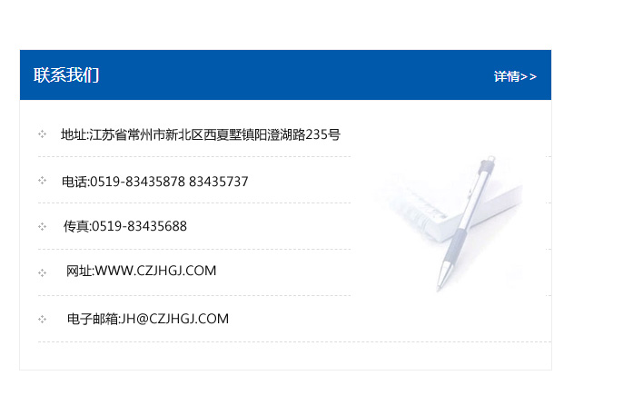 地址:常州市新北區友邦商務大廈1幢16、17層  電話:0519-85101652  傳真:0519-85112595  郵編:213022  網址:www.cz-jiayue_cn.moyunso.com  郵箱:xiajifengaa@163.com